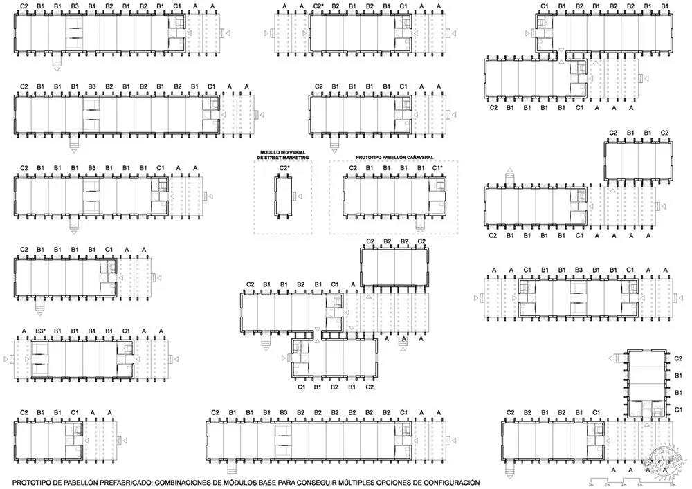 這是一個靈活重配置的工業(yè)體系。預(yù)制展館原型基于標(biāo)準(zhǔn)模塊的多種形式,是靈活多變的體系。這種模塊化附加類型項目可以根據(jù)不同的項目需求進行配置,其中包括大型博物館大廳和小規(guī)模辦公室等多種組合。