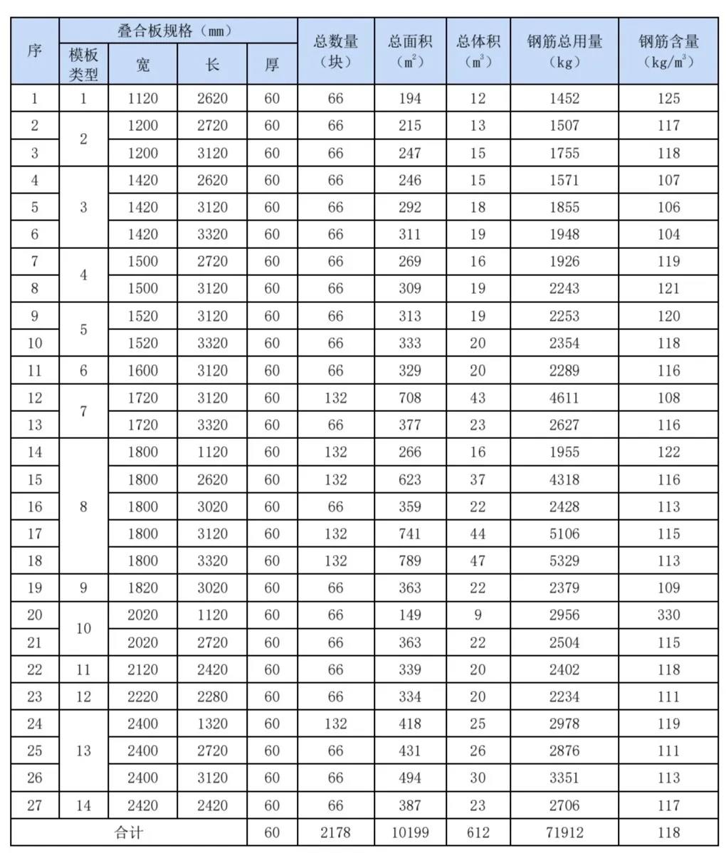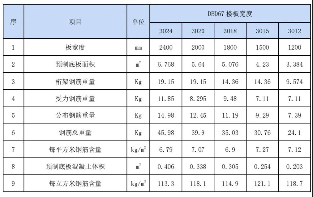 不同寬度預(yù)制底板的鋼筋含量計算明細(xì)如下表所示: