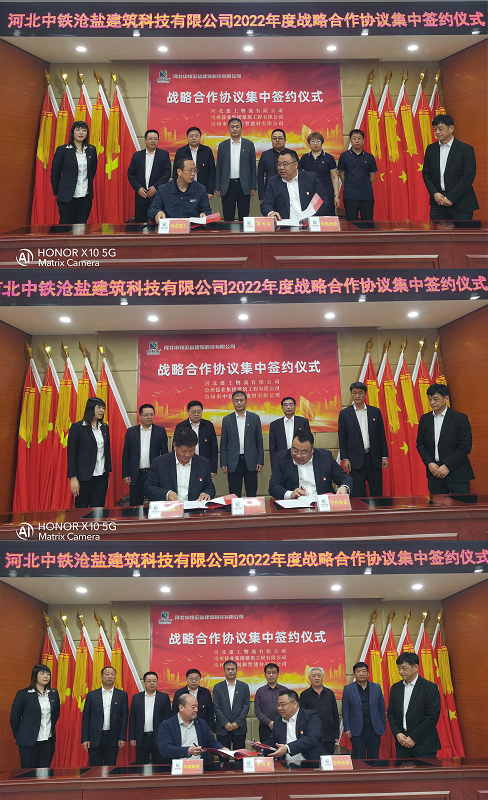 河北中鐵滄鹽建筑科技有限公司執(zhí)行董事長王峰偉,黨支部書記、總經(jīng)理王志巖,總會計師李紅標,河北建工物流有限公司黨總支書記、董事長劉云濤,雄安區(qū)域總經(jīng)理馮曉潔,雄安區(qū)域副總經(jīng)理李增光,滄州區(qū)域總經(jīng)理李勇,滄州鹽業(yè)集團建筑工程有限公司總經(jīng)理姬文革,黨支部書記、副總經(jīng)理崔治宇,辦公室主任左志海,滄州市中潤新型建材有限公司總經(jīng)理姜海亮出席簽約儀式,三家公司代表分別與中鐵滄鹽簽訂戰(zhàn)略合作協(xié)議。